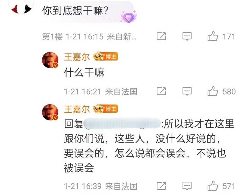 有粉絲問他「你到底想幹嘛?」嘎嘎回應「什麼幹嘛?」同樓層許多粉絲勸王嘉爾不要參與粉絲吵架👇