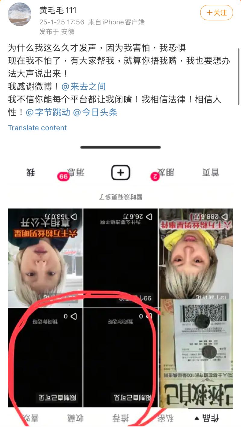 黃毛毛隨後再發文,表示自己的視頻一直被炸,自動轉為「僅自己可見」,表示張大大全平台控制輿論👇