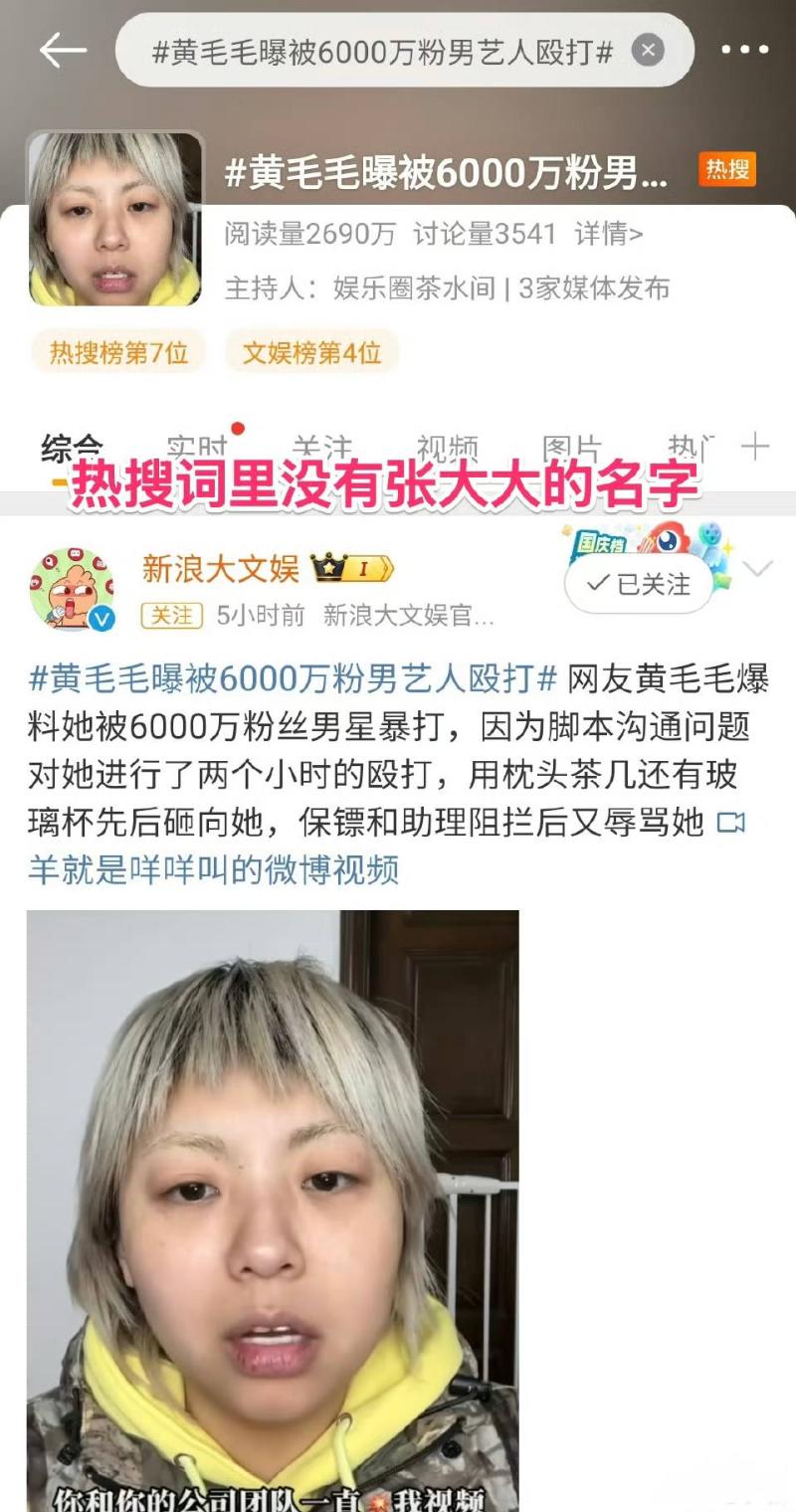 網友嘗試搜尋「黃毛毛」,可以看到#黃毛毛曝被6000萬粉男藝人毆打#這個話題,卻看不到張大大的名字。