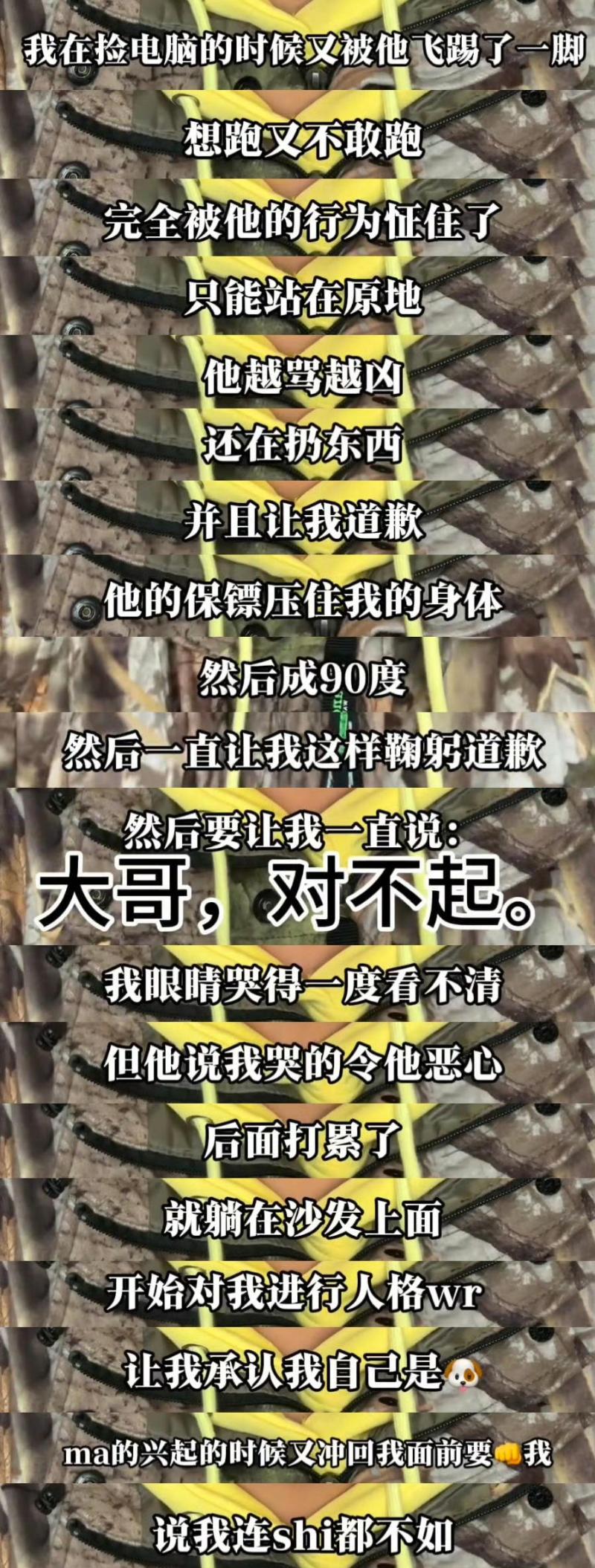 來看看,黃毛毛在25號這天公開視頻,表示這位全網6000萬粉絲男星,在2024年10月27日,因為腳本溝通問題,對自己進行了長達兩小時的“非人傷害”,用枕砸、掀起茶几砸、用玻璃杯砸。毆打愈發激烈後,其保鑣助理才開始阻攔,該藝人不准黃毛毛離開房間,砸了她的電腦。她撿電腦時還被飛踢一腳。該男星不斷辱罵,要求黃毛毛道歉,其保鑣摁住黃毛毛的頭強行讓她彎腰道歉,要求她說「大哥對不起」。