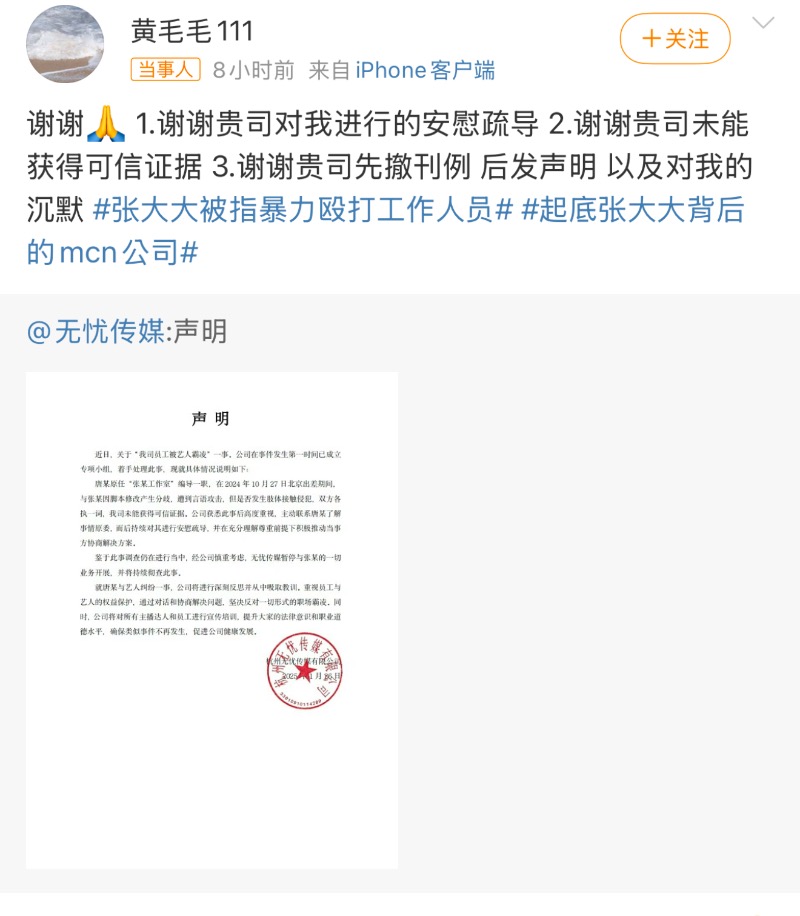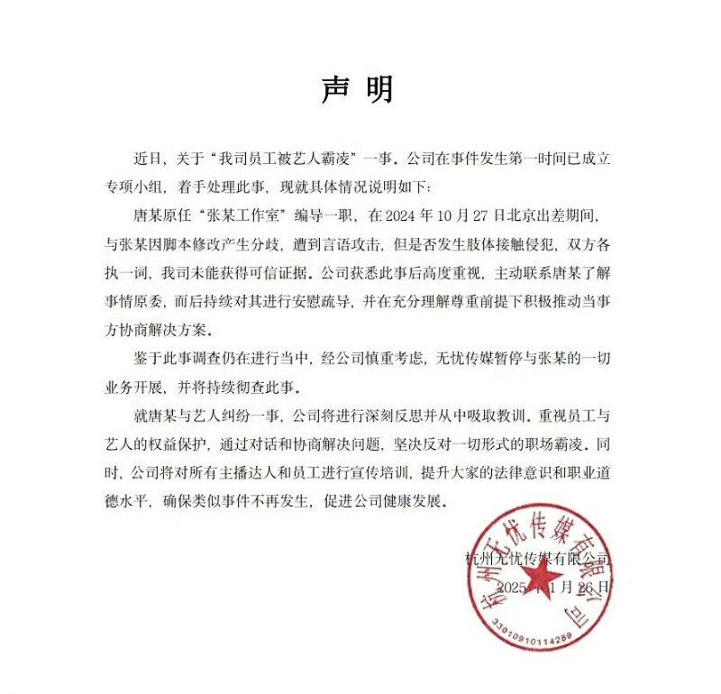 隨後,其經紀公司無憂傳媒發布聲明,回應了關於’我司員工被藝人欺凌’的事件。聲明中提到,編導唐某在2024年10月27日在北京出差期間,因腳本溝通問題與張大大發生了衝突,遭到了言語攻擊。鑑於調查仍在進行中,無憂傳媒決定暫停與張大大的一切業務合作。無憂傳媒表示將繼續調查此事,確保公正處理。