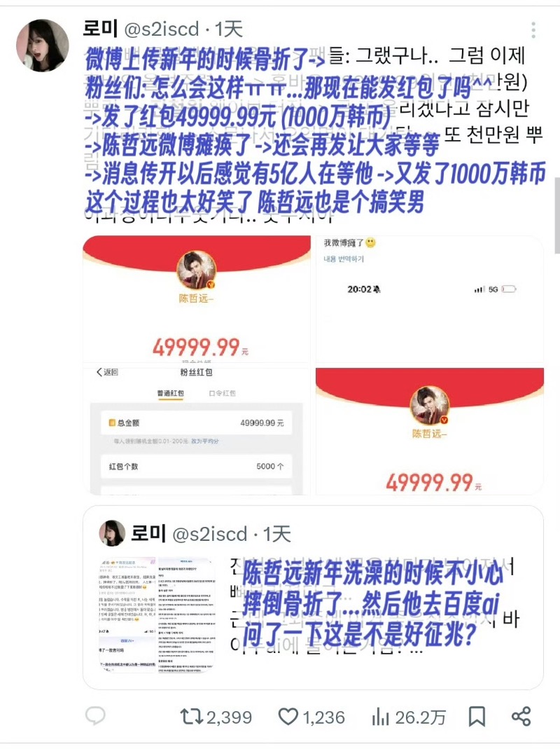就是說,沒想到陳哲遠派個紅包,不但在內娛一夜漲粉350萬,甚至在韓網也大出圈啊!