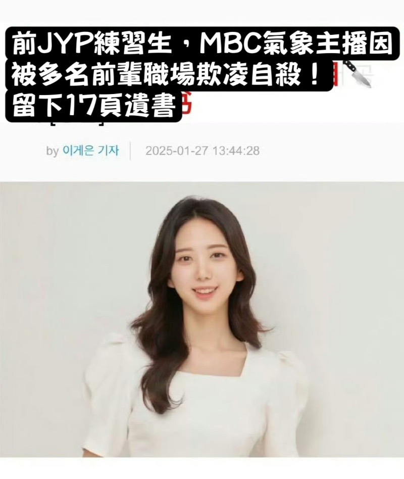 1996年出生的吳曜安娜,曾是JYP練習生,在2021年加入MBC當氣象主播,但在2024年9月自殺,得年28歲,讓不少網友相當惋惜。
