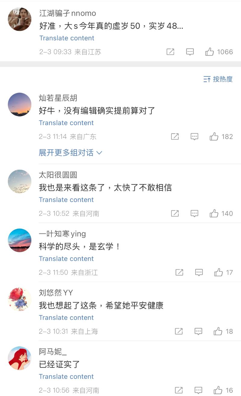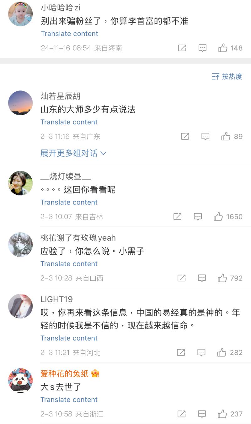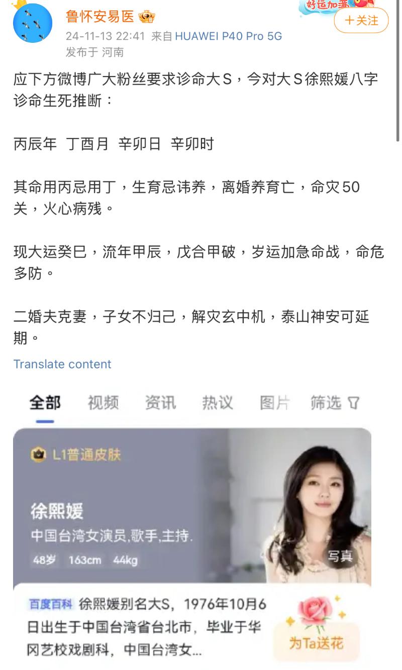 雖然但是,在中國微博卻在瘋傳一則去年11月的貼文。這則由一個中國命理師發的貼文,當中提到了大S五十歲有命災,並提到「命危多防」