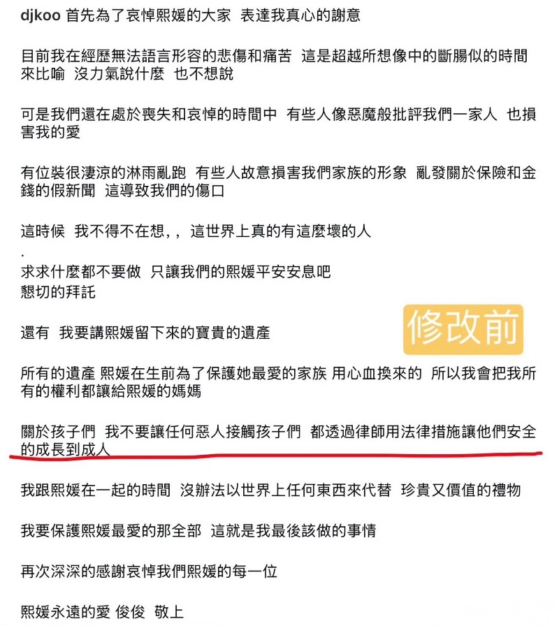 隨後,具俊曄修改了內文,提到自己強調的是孩子們的權利,也就是歸於孩子們的財產。