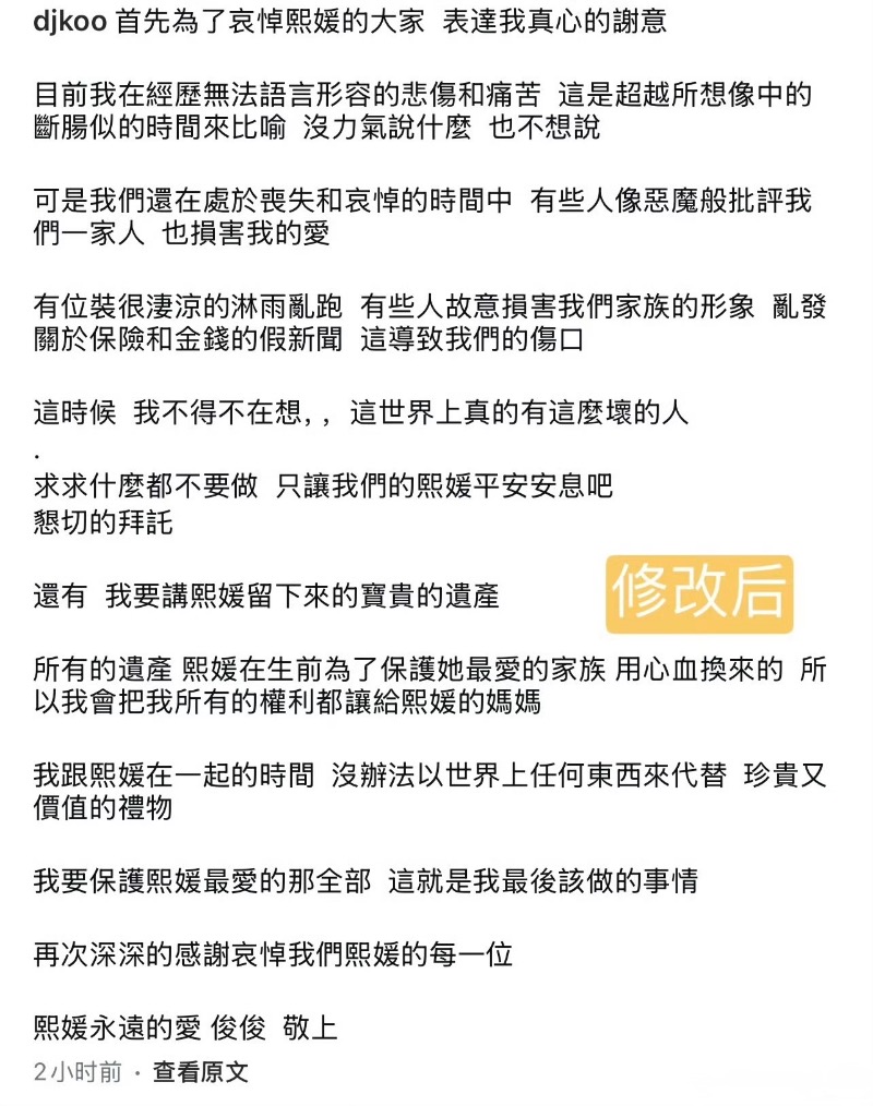 新聞:沈默數天⋯具俊曄發長文悼念大S!財產權利讓給S媽!不會讓孩子接觸惡人!