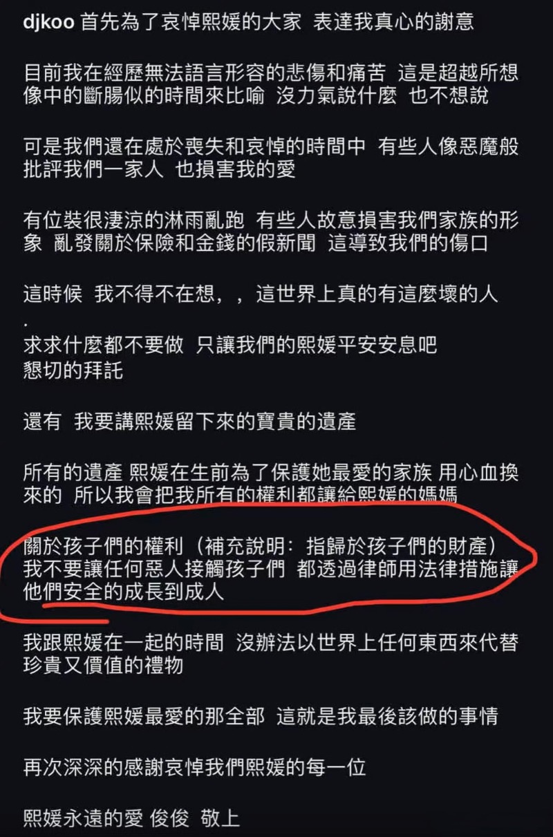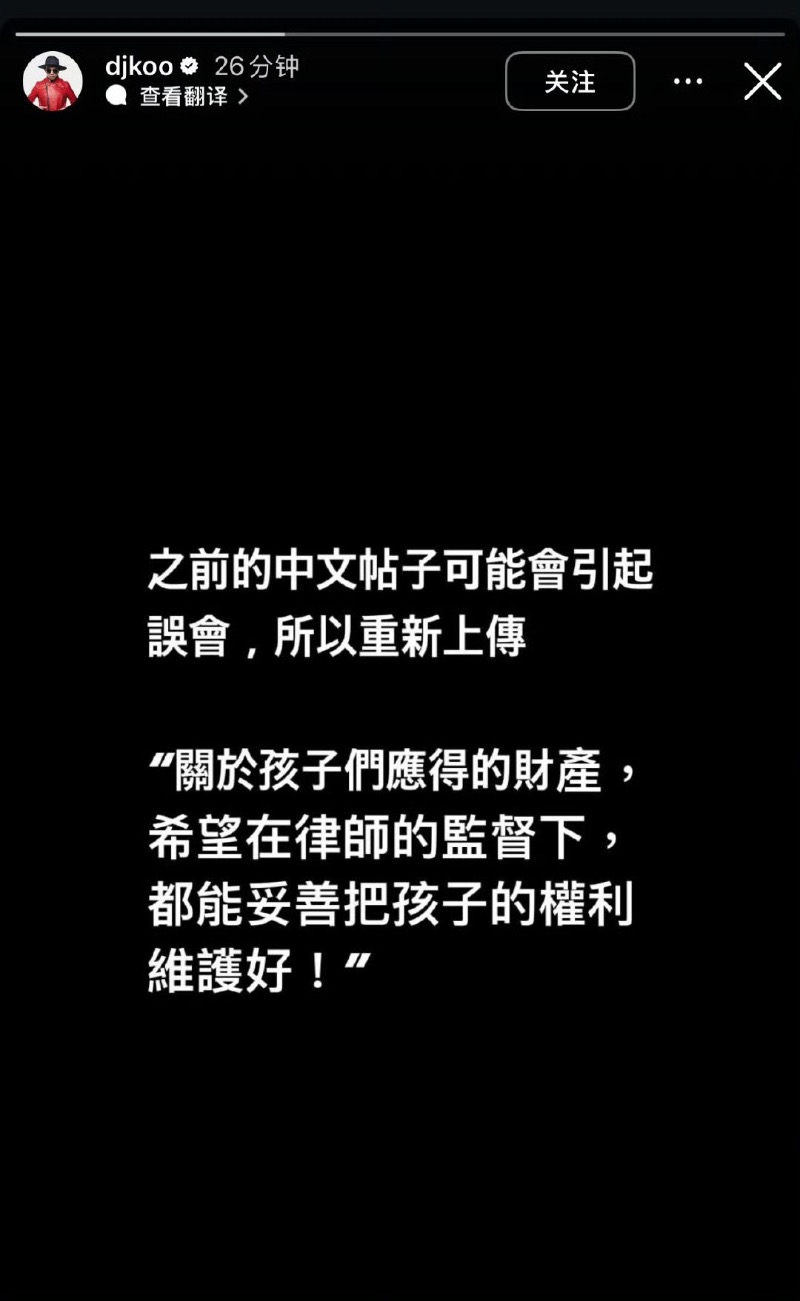 他也在限動補充,表示擔心引起誤會,所以重新上傳:「關於孩子們應得的財產,希望在律師的監督下,都能妥善把孩子的權利維護好!」
