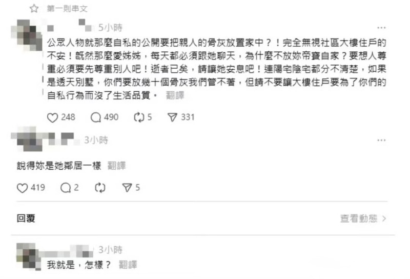 不料有一名網友在社群平台Threads發文抗議,表示:「公眾人物就那麼自私的公開要把親人的骨灰放置家中?!完全無視社區大樓住戶的不安!既然那麼愛姊姊,每天都必須跟她聊天,為什麼不放妳帝寶自家?要想人尊重必須要先尊重別人吧!逝者已矣,請讓她安息吧!連陽宅陰宅都分不清楚,如果是透天別墅,你們要放幾十個骨灰我們管不著,但請不要讓大樓住戶要為了你們的自私行為而沒了生活品質。」