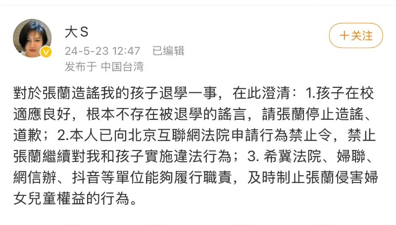 雖然如此,網友對於張蘭帳號被封表示歡迎,也發現大S微博最後一個心願終於在她離世之後達成,那就是希望抖音等平台和單位能夠履行相應職責,及時制止張蘭侵害婦女兒童權益的行為。