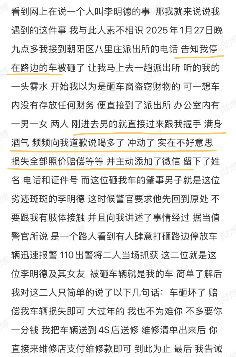 前女友發文直接爆了熱搜,但不少粉絲認為這是造謠,沒想到不久,女友爆料文中提到的被砸車的車主也發文回應了,表示李明德砸車後去了警察局,在現場一開始態度良好答應賠償,車主就和李明德互加了聯系方式。