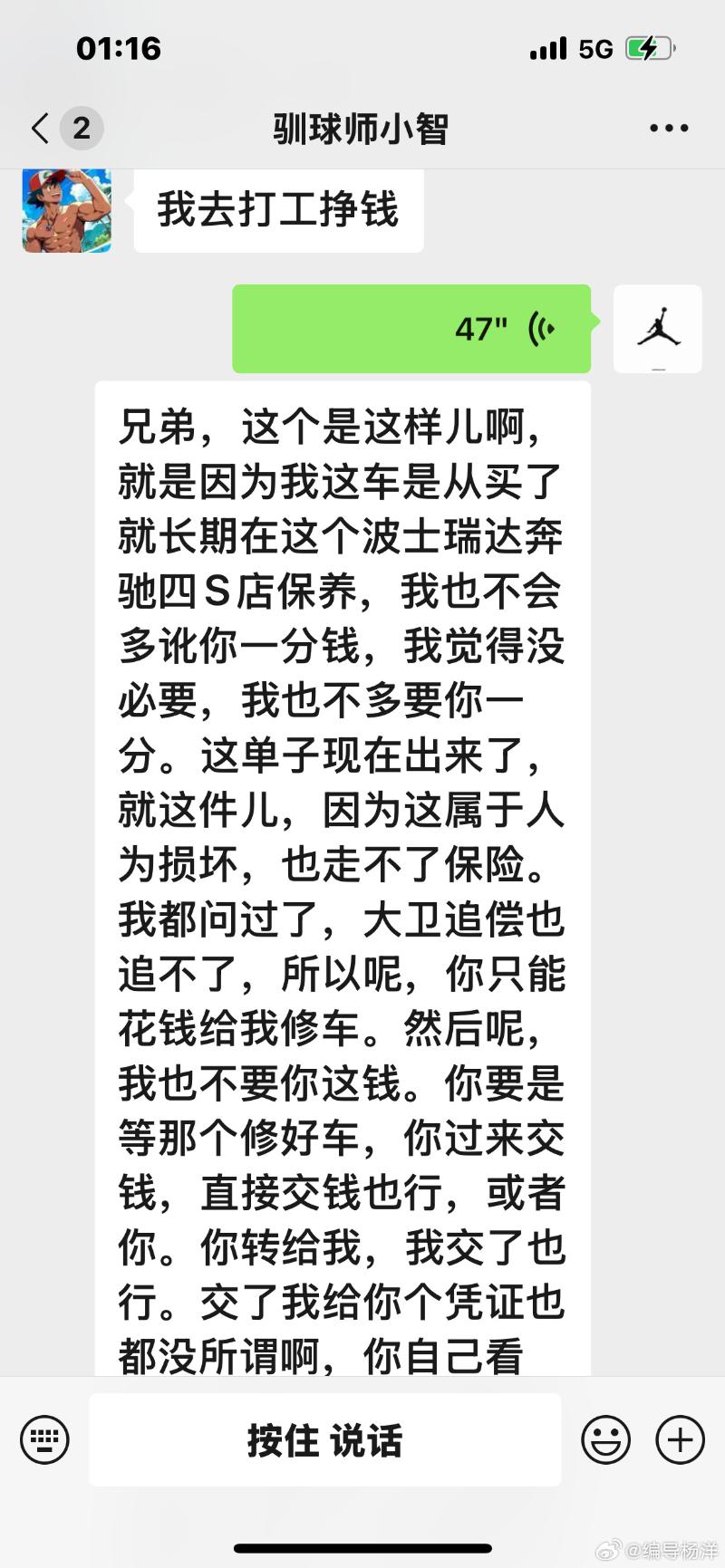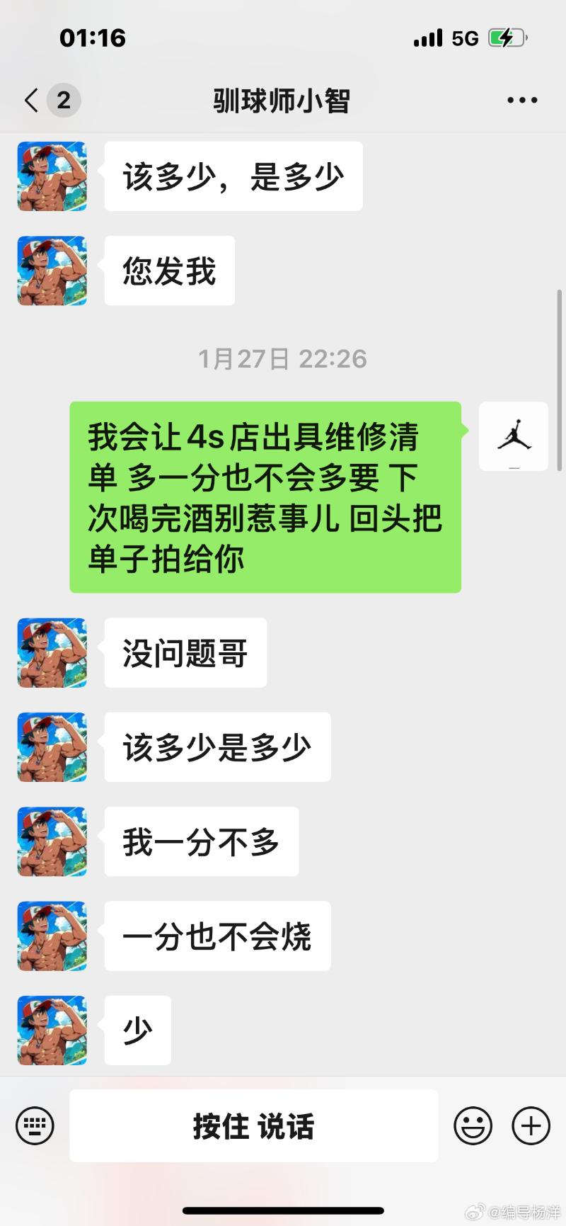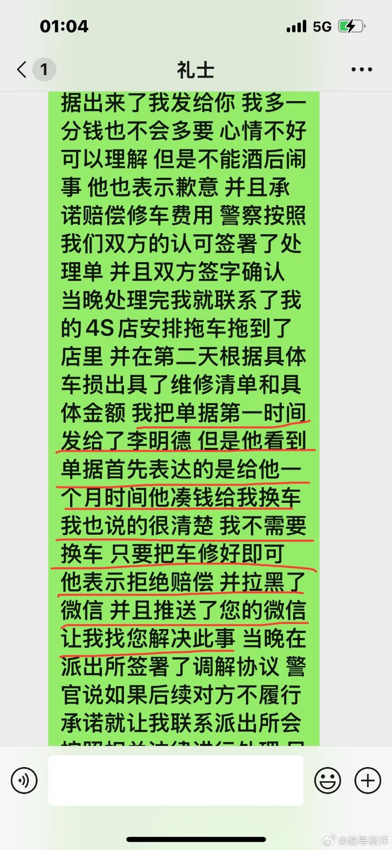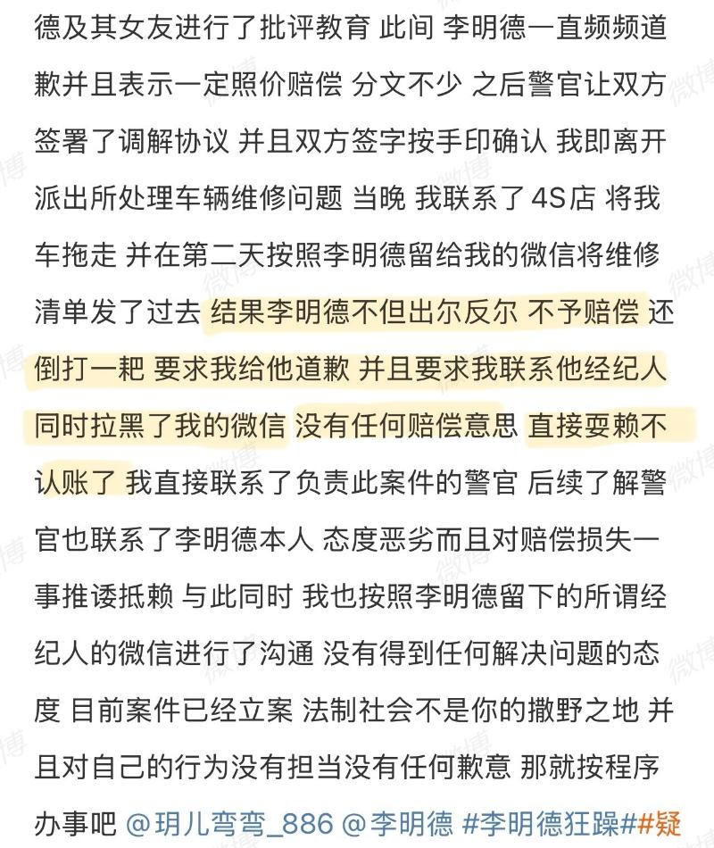 第二天車主給李明德發了維修清單,維修費是9萬多,李明德出爾反爾不認賬並推脫抵賴,還要求車主給他道歉,最後還刪了車主,讓車主去跟經紀人聯系。 車主稱目前沒有得到任何解決問題的態度,已經立案。車主原文👇