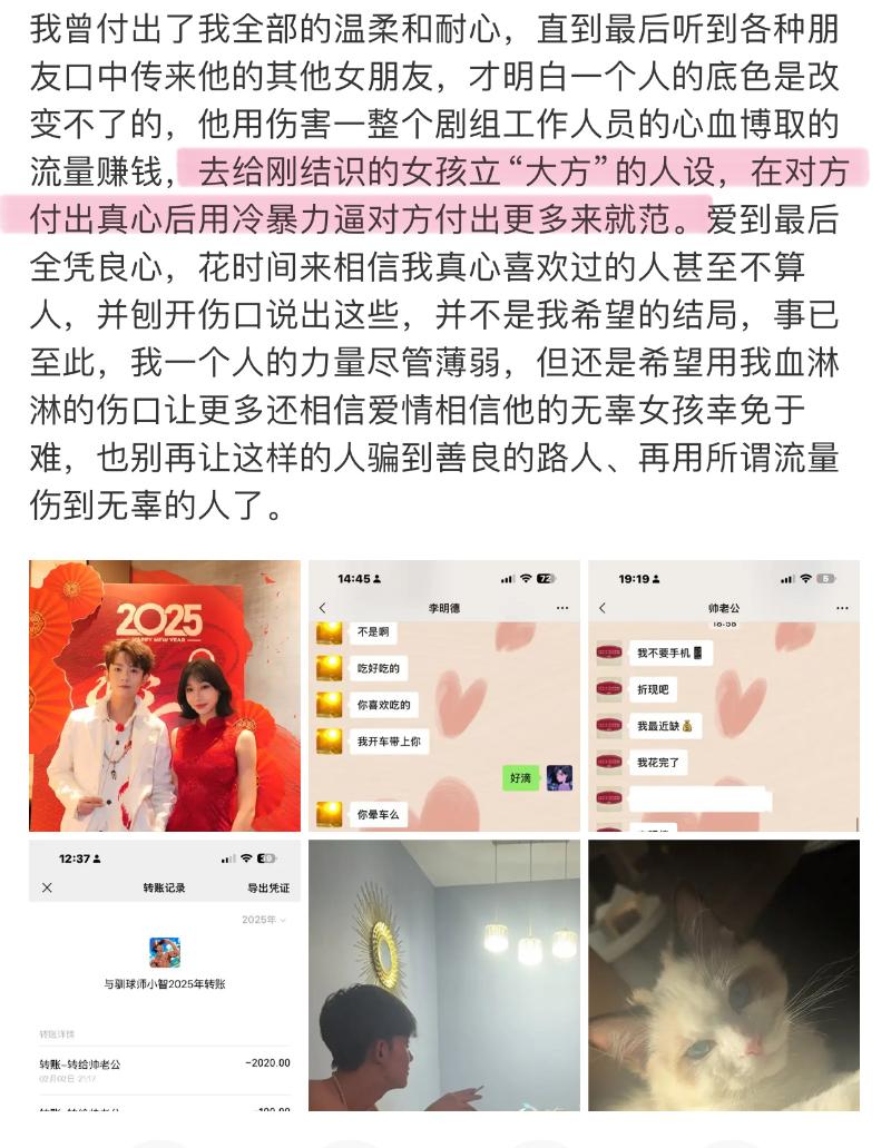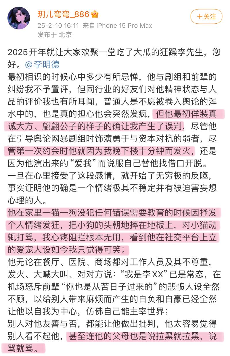 當時李明德的人設是踏踏實實演戲的小糊咖,待人平易近人等,沒想到這些人設在之後的日子一次又一次被推翻,大過年的,連前女友都出來發長文錘他了!前女友爆料重點如下👇