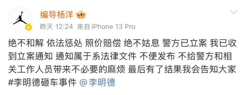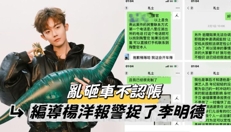 熱搜第一!砸車後拒不負責反要求道歉!編導楊洋報警捉了李明德「絕不和解!」