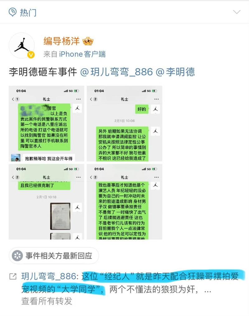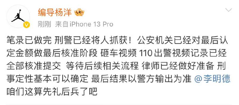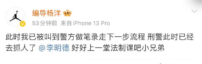 結果12號這天,這位微博號「編導楊洋」的車主再發文,表示自己被叫去警方做筆錄,刑警已經去捉人了,並艾特了李明德!