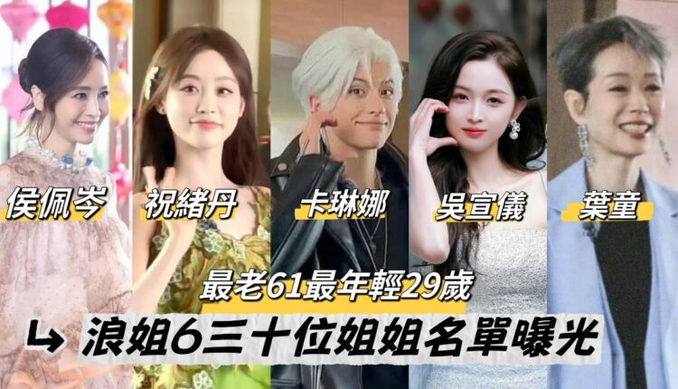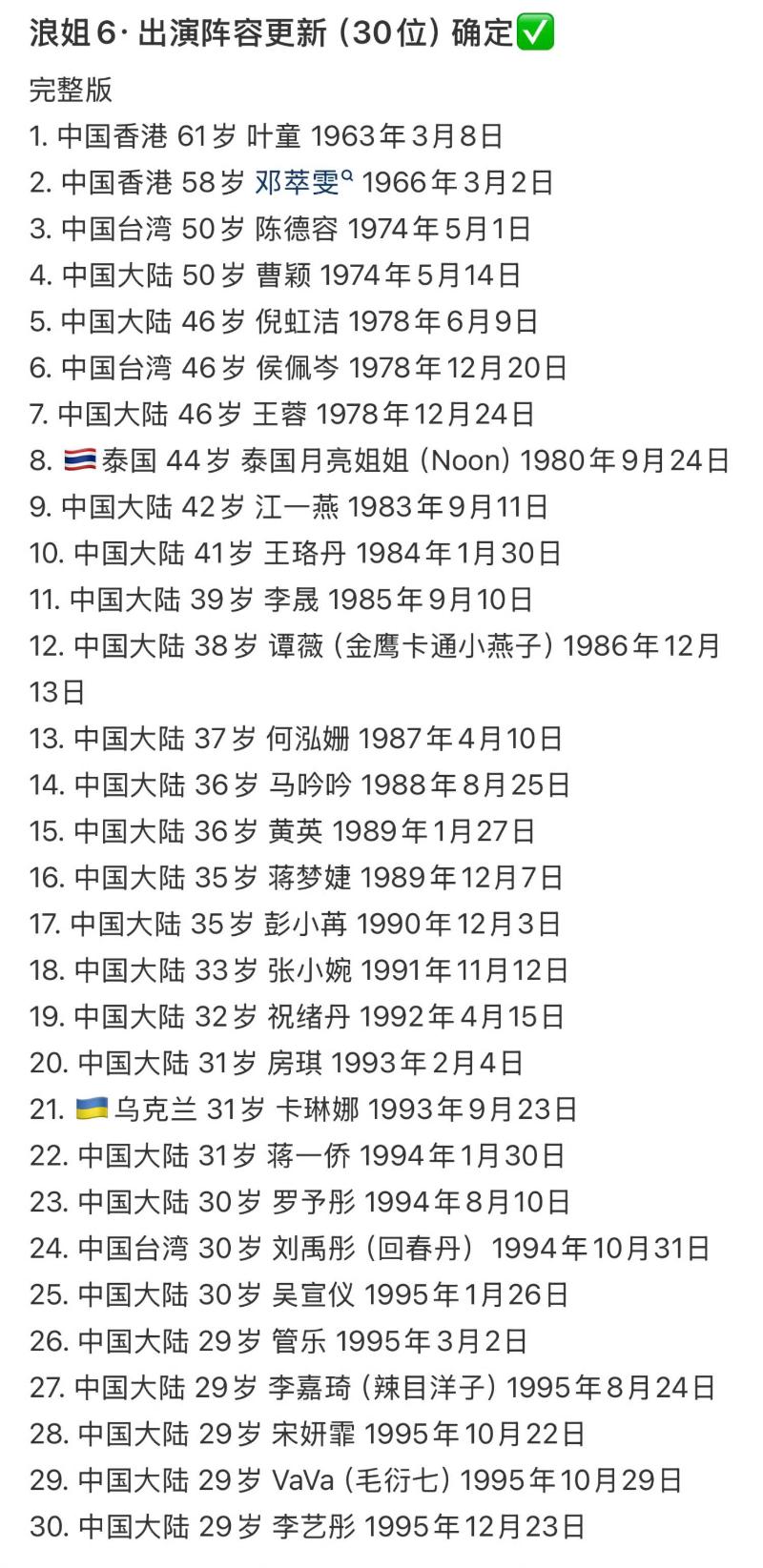 葉童 鄧萃雯領軍!《浪姐6》三十位姐姐名單曝光!最大61歲最小29歲列表看起! 綜藝星聞 By 歐巴是我的 Last updated Feb 12, 2025 Share 哇~終於開錄啦!是噠,芒果台每年的大秀之一,就是已經來到第六季的《乘風破浪》,這一季已經在海南開錄,而姐姐們的路透也逐一被拍到啦!這就看起👇 葉童 黃英👇 吳宣儀 馬吟吟 羅予彤 鄧萃雯 江一燕 倪虹潔 李晟 彭小苒 VAVA 月亮姐姐 李藝彤 張小婉 卡琳娜 祝緒丹 李嘉琦 何泓姗 侯佩岑 陳德蓉 王珞丹 而未拍到路透的姐姐則包括了管樂、蔣一橋、房琪、譚薇、劉禹彤、王蓉、曹穎和蔣夢婕!而中國網友也整理了目前肯定的30位姐姐的生日排序,這就看起👇 圖來源:部分照片取自網絡,若侵權請告知 Share