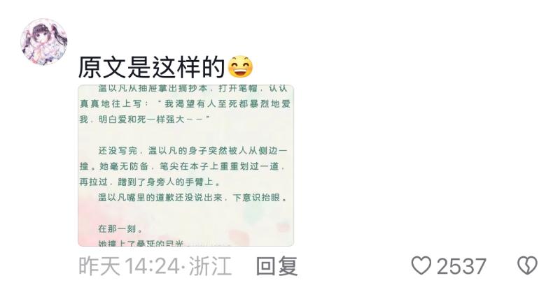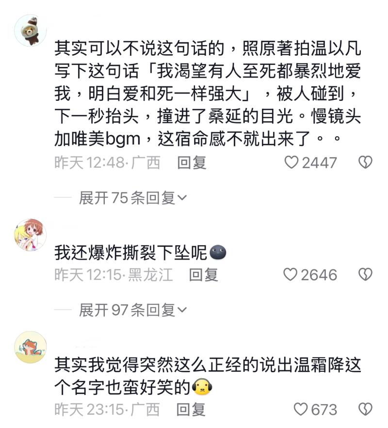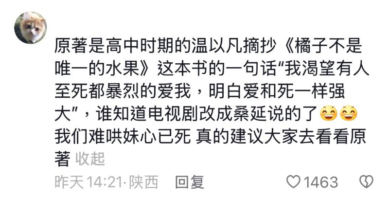 這段台詞也引起原著粉不滿,因為原著中,這段話原本是溫以凡從另一本國外小說中看到,覺得很好而抄下來的。結果影劇版居然變成了由桑延說出來,而且完全改成了另一種版本!