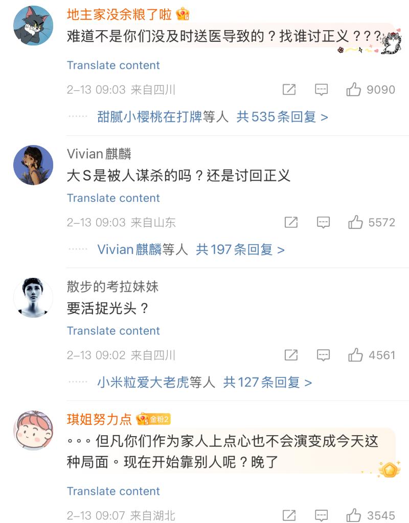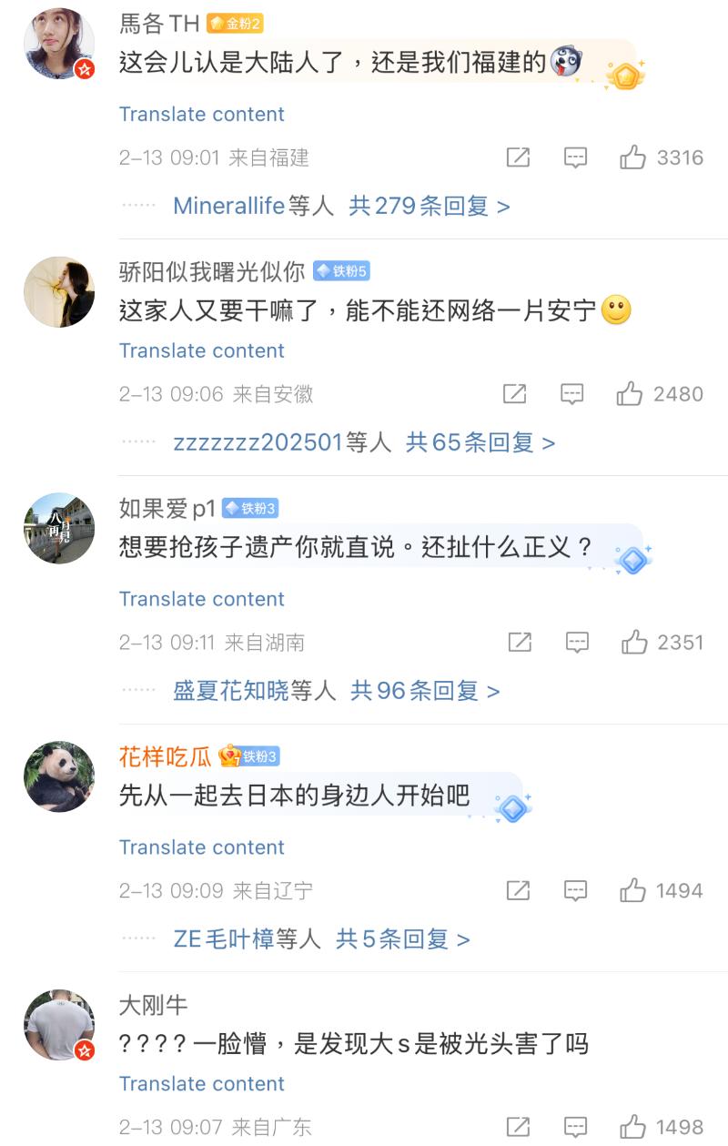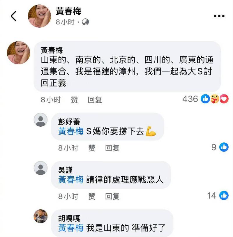 之後S媽又在評論區補充:「山東的,南京的,北京的,四川的,廣東的通通集合,我是福建的漳州,我們一起為大S討回正義。」