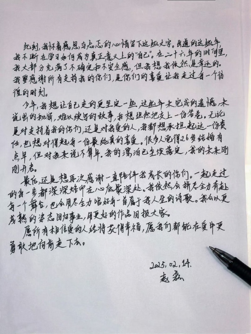 在官宣結婚之後,趙磊還發了親筆信給粉絲👇