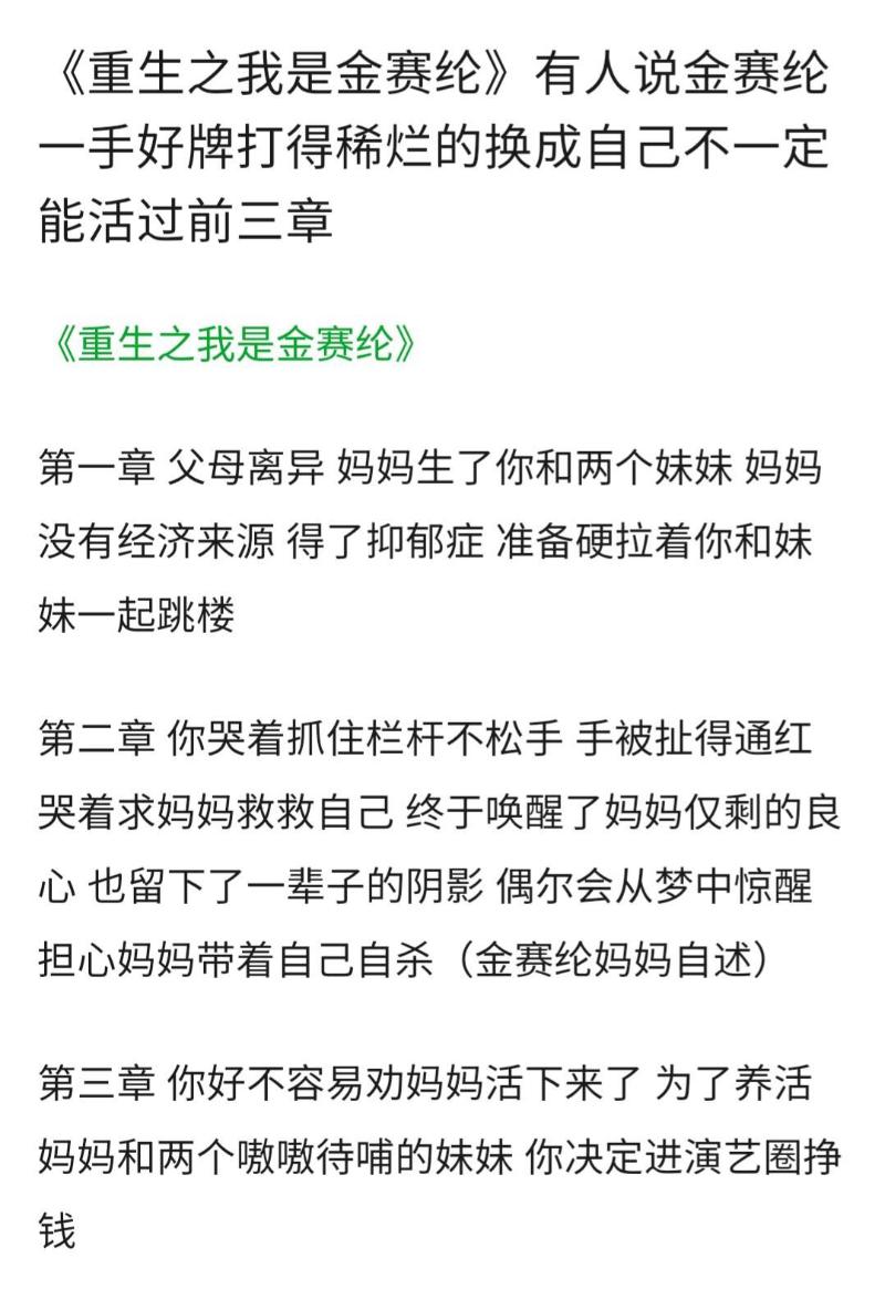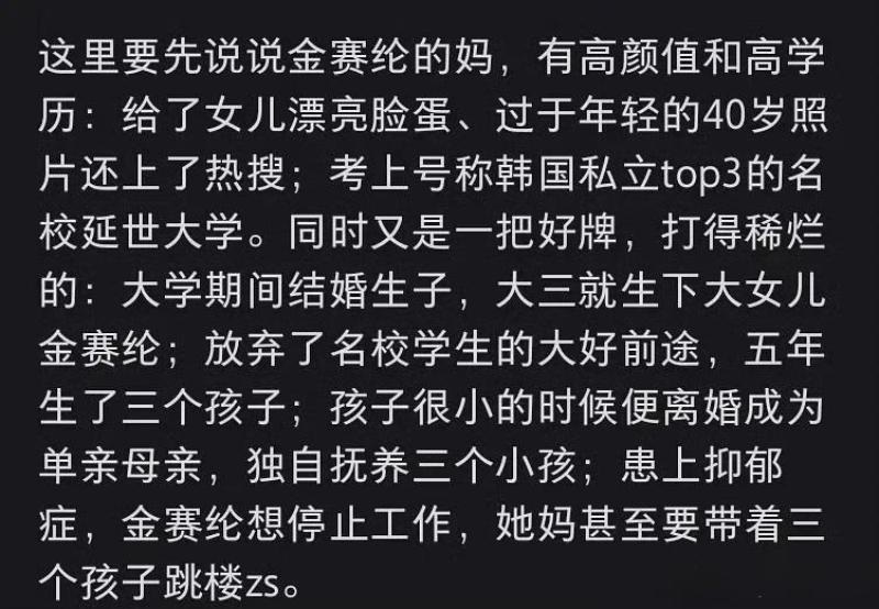 有網友總結了金賽綸原生家庭帶來的影響,先來看看,金賽綸來自單親家庭,除了她還有兩個妹妹,媽媽是高顏值的學霸,曾是韓國頂尖的延世大學的學生,但因為戀愛懷了金賽綸就休學,最後連文憑都沒拿到,在孩子很小時就離婚,獨自撫養三個小孩,也因此有了憂鬱症。