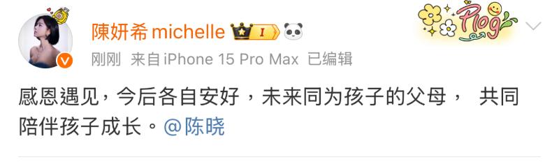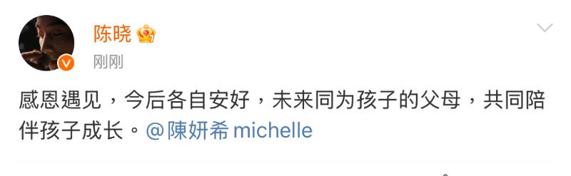 是噠,陳曉、陳妍希雙雙發文,使用了同樣的文案官宣離婚:「感恩遇見,今後各自安好,未來同為孩子的父母,共同陪伴孩子成長。」並艾特了對方的名字,27個字結束了長達9年的婚姻。