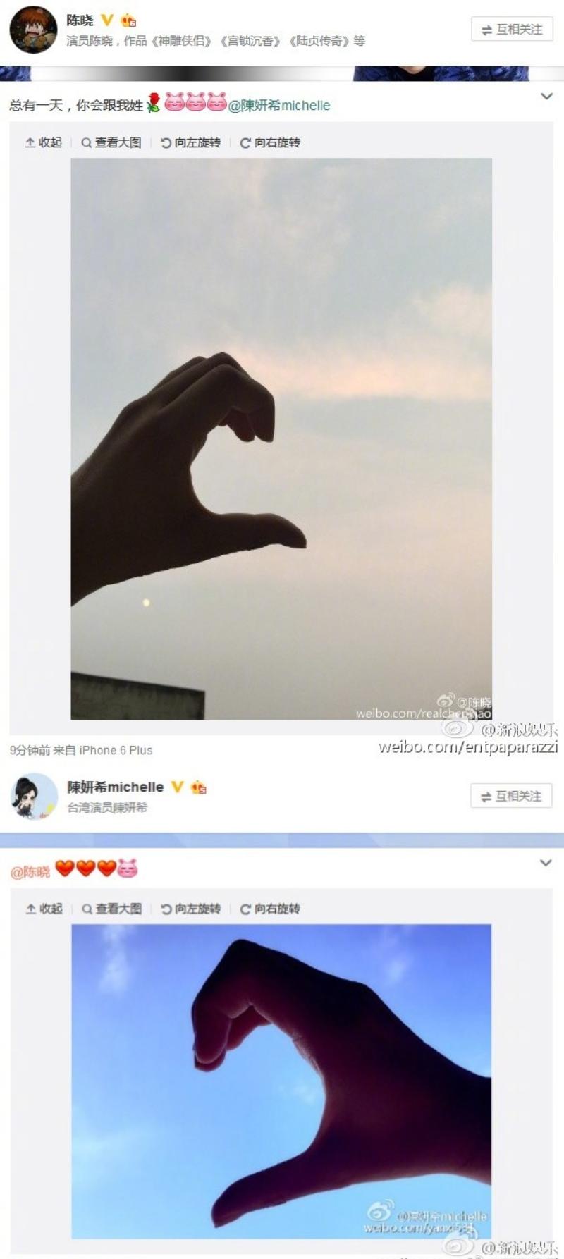 2015年8月26日,兩人被曝光連續三次約會,並在8月16日北京入住同一個房間,戀情曝光;當天,陳曉經紀人承認戀情,但表示這是藝人的私生活,自己也不大了解,陳曉現在在拍戲,具體情況會由他本人說明。隔天,陳曉、陳妍希分別在微博發了一半心,官宣戀情。陳曉文案:「總有一天,你會跟我姓。」陳妍希艾特了陳曉。