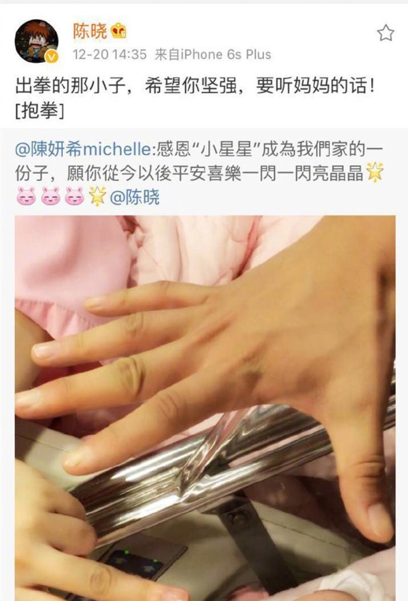 2016年12月20日,陳妍希官宣生子喜訊:「感恩‘小星星’成為我們家的一份子,願你從今以後平安喜樂一閃一閃亮晶晶。」陳曉轉發:「出拳的那小子,希望你堅強,要聽媽媽的話。」