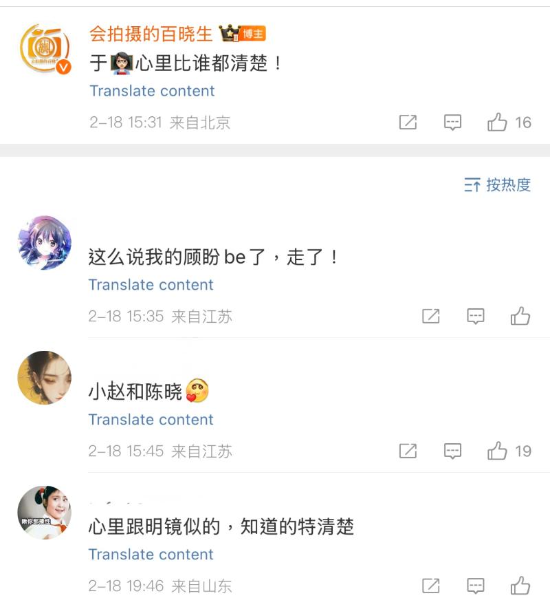 然後在評論區追加評論,表示:「于正心裡比誰都清楚」評論區都在cue陳曉和趙麗穎👇