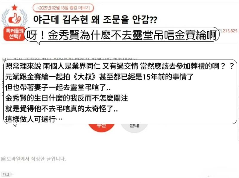 就有韓網友以「呀!金秀賢為什麽不去靈堂弔唁金賽綸啊?」發帖,內容提到:「按常理來說,兩個人是業界同仁,又有過交情,當然應該去參加葬禮的啊??元斌跟金賽綸一起拍《大叔》甚至都已經是15年前的事情了,但也帶著妻子一起去靈堂弔唁了…金秀賢的生日什麽的我反而不怎麽關注,就是覺得他不去弔唁真的是太奇怪了…這樣做人可還行….」