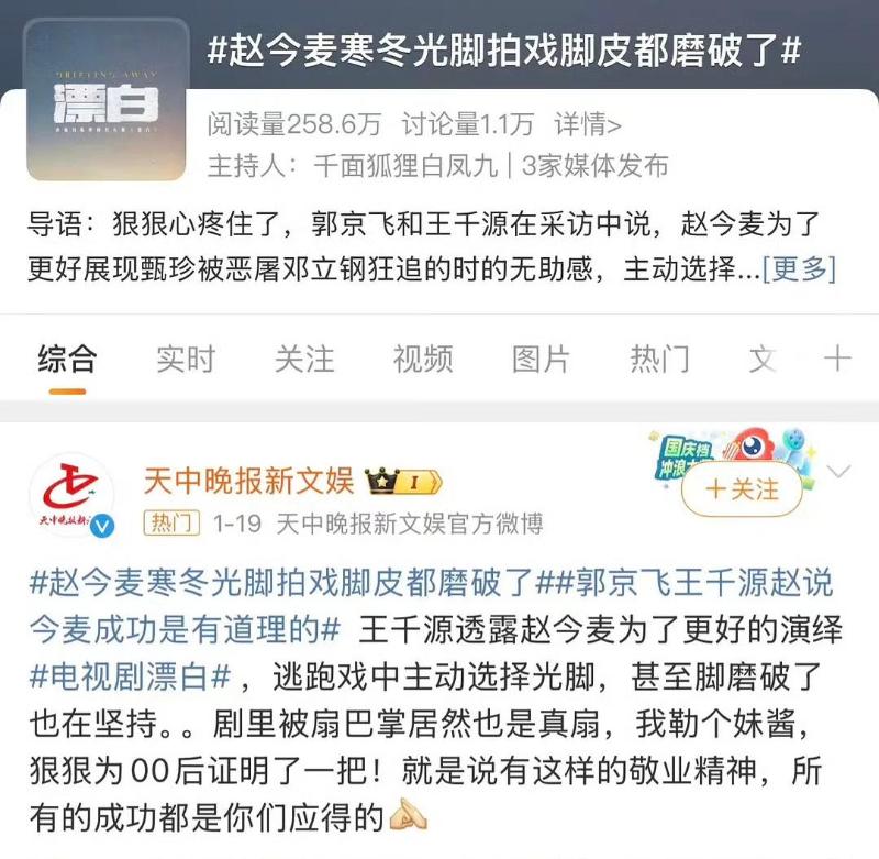 諷刺的是,這個劇組之前還因為趙今麥光腳拍戲磨破皮誇她敬業👇