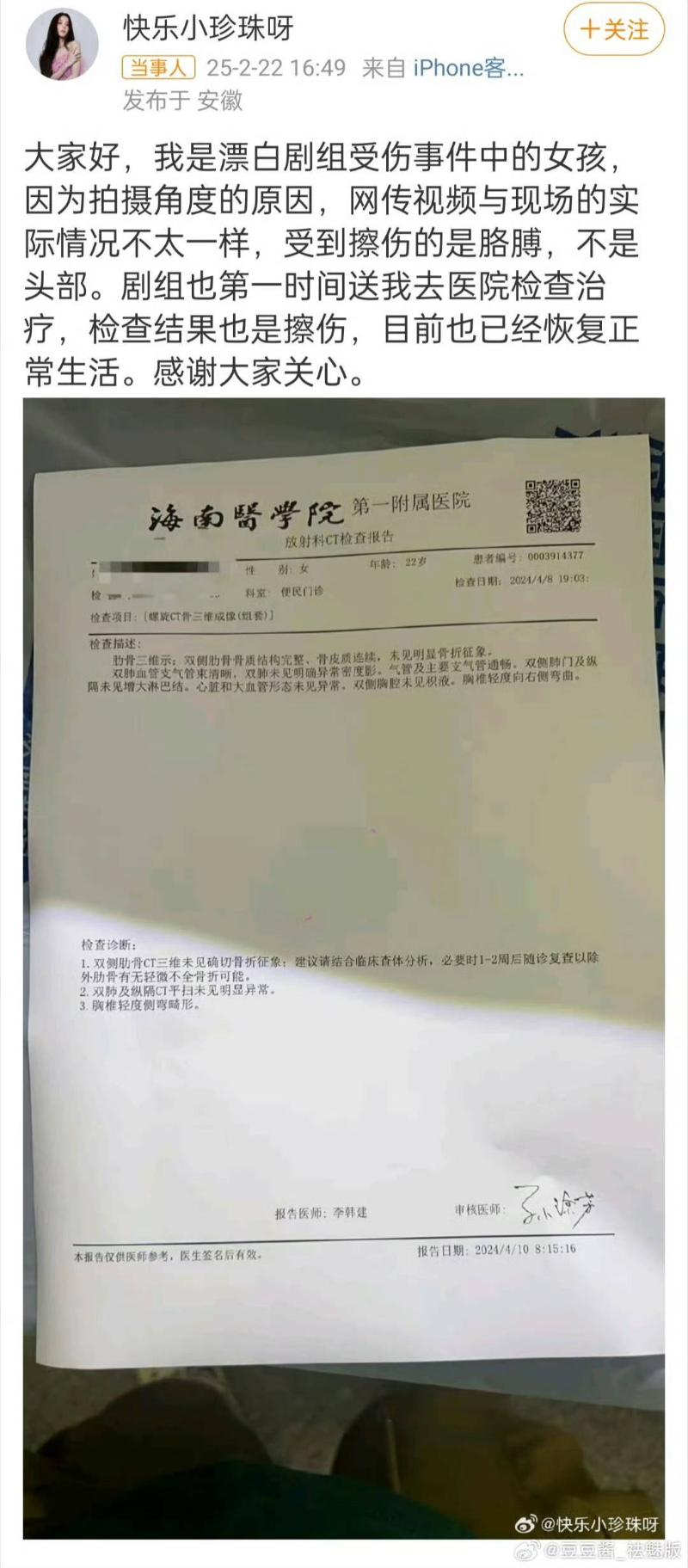 視頻一曝光,直接爆了熱搜,不少網友對於替身演員目前的狀況表示關心,隨後,有一名自稱是該替身演員的女孩發文,表示視頻拍攝角度問題,實際傷到的是胳膊,不是頭部,劇組第一時間送她去醫院:「目前也已經恢複正常生活。」