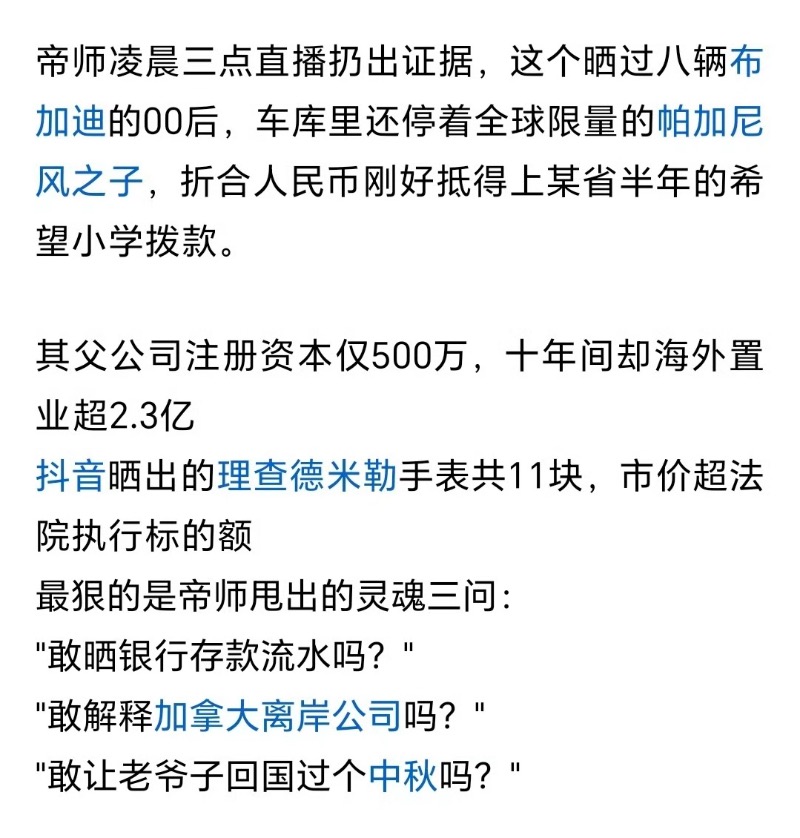 網紅「帝師」凌晨直播,直接公開富二代父親真實姓名、護照號、法院執行判決和隱晦轉移資產等資訊👇