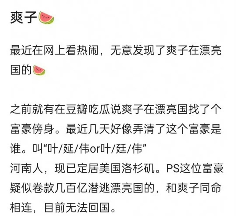 沒想到的是,近日鄭爽又有瓜被爆?有網友表示自己吃到了鄭爽的瓜,表示之前就吃過她在美國找了個富豪的瓜,最近意外搞清了富豪身分,就是在中國國內卷了幾百億潛逃到美國的河北富豪。