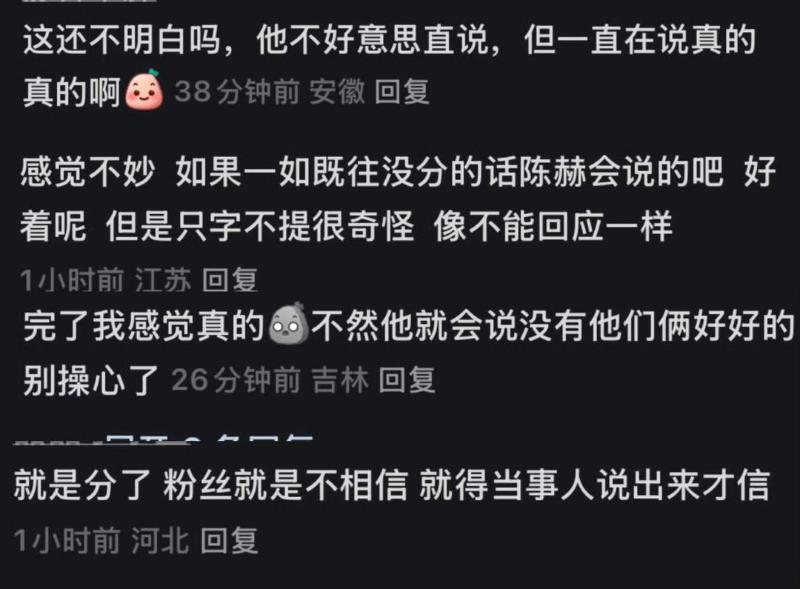 不過對於陳赫的反應,網友們有不一樣的解讀,認為感覺應該是分了,不然兩人算是公開的情侶,沒分的話,一句話回應就可以了啊👇