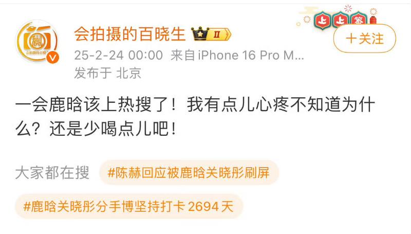 狗仔「百曉生」在23號深夜發文,表示:「一會鹿晗該上熱搜了!我有點心疼不知道為什麽?還是少喝點吧!」