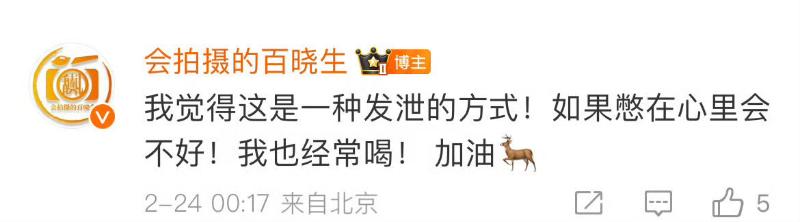 隨後又發帖表示:「我覺得這是一種發泄方式!如果憋在心裏會不好,真挺羨慕的!有這麽一幫哥們兒陪著」,甚至直接艾特了鄧超,暗示鹿晗分手鄧超在陪他喝酒。