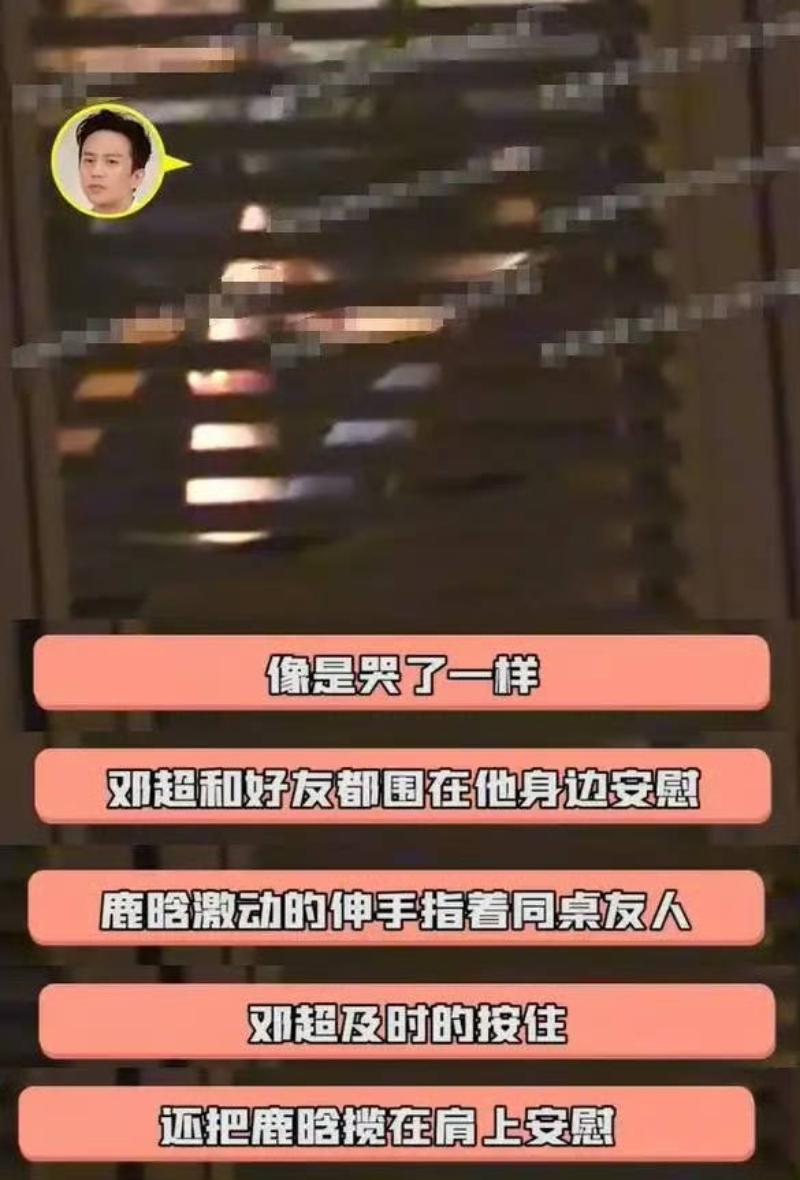 而在狗仔公開的視頻中,狗仔表示鹿晗似乎情緒不太好,在餐館中疑似是哭了一樣,鄧超和好友都圍在他身邊安慰。中途不知道為何,鹿晗疑似激動的伸手指著同桌友人,鄧超及時的按住,還把鹿晗攬在肩上安慰。