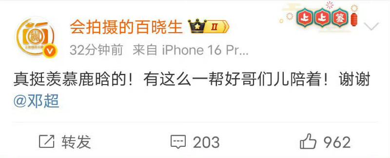 隨後又發帖表示:「我覺得這是一種發泄方式!如果憋在心裏會不好,真挺羨慕的!有這麽一幫哥們兒陪著」,甚至直接艾特了鄧超,暗示鹿晗分手鄧超在陪他喝酒。