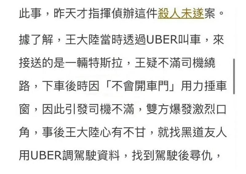 根據台媒,王大陸是在返台期間,因為搭到特斯拉,開始時疑似不滿司機繞路,在下車時又因為不會開車門用力捶車窗,與網約車司機爆發激烈口角。據悉,王大陸之後心有不甘,竟教唆黑道友人痛毆接送車司機及派車員成重傷。