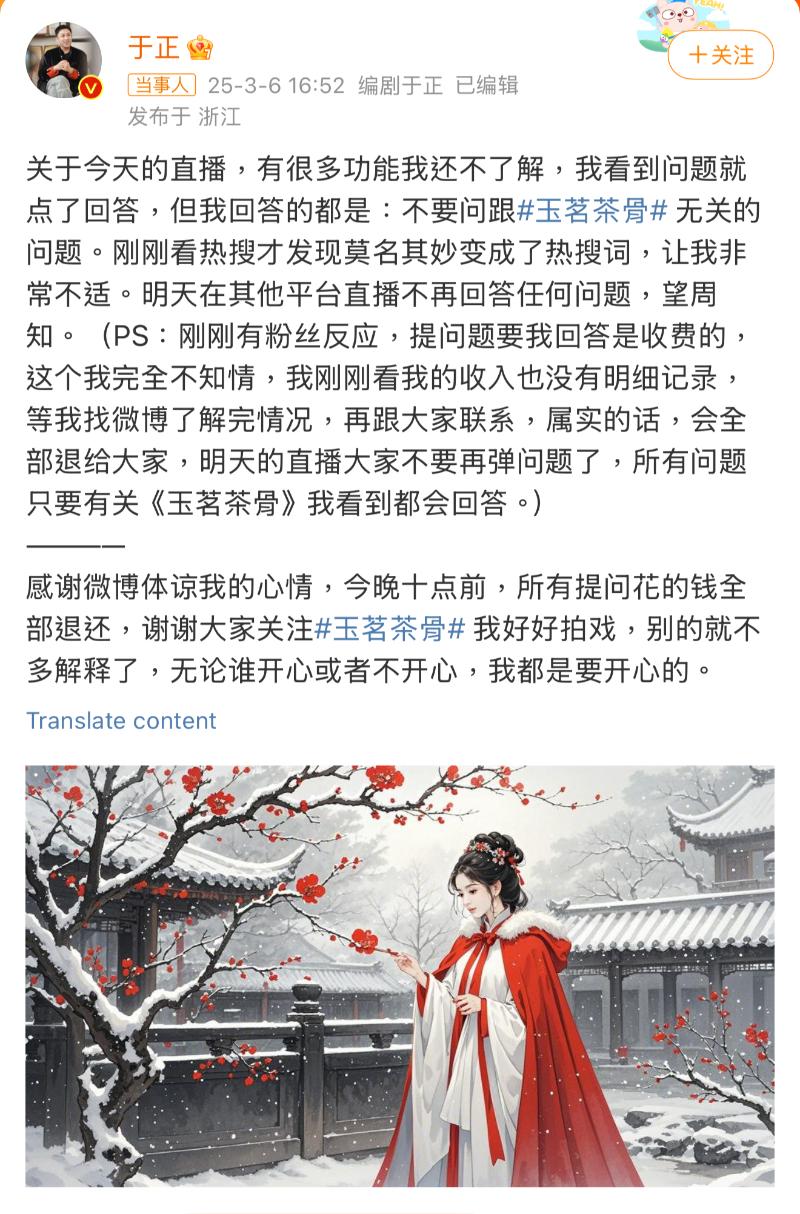 事實上,點開進去他也沒有正面回應,只不過因為他這番操作,再次把趙麗穎和陳曉推上了熱搜!隨著熱搜第一,于正再次發文回應這個本質為新劇宣傳的衍生事件,表示自己「無意為之」,並表示將退款給付費的網友,順便再宣傳一次自己的新劇👇