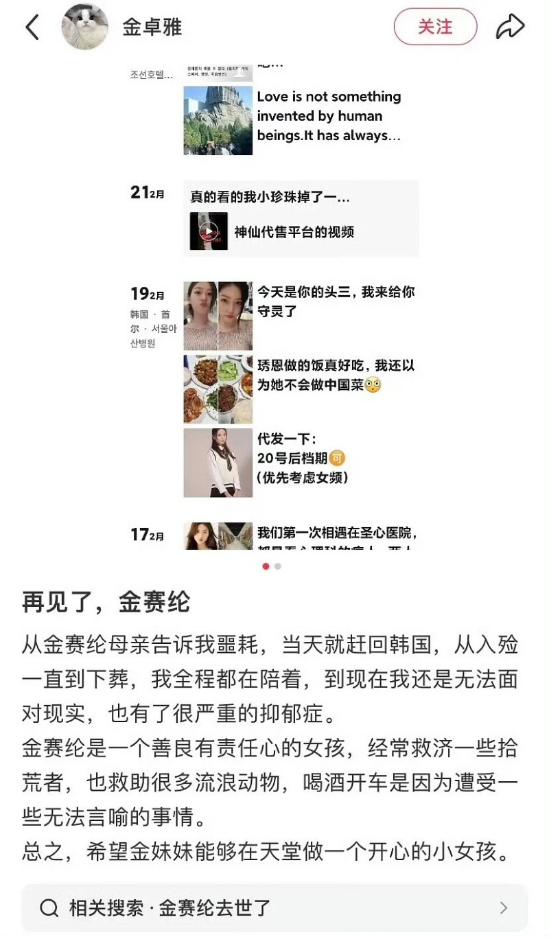 隨著金賽綸生前委屈被曝光,有自稱是金雅任(金賽綸新改名字)好友的網友留言表示,當時金賽綸酒駕也另有隱情,原來是經紀公司讓她去陪客戶,她匆忙逃跑才發生了意外。