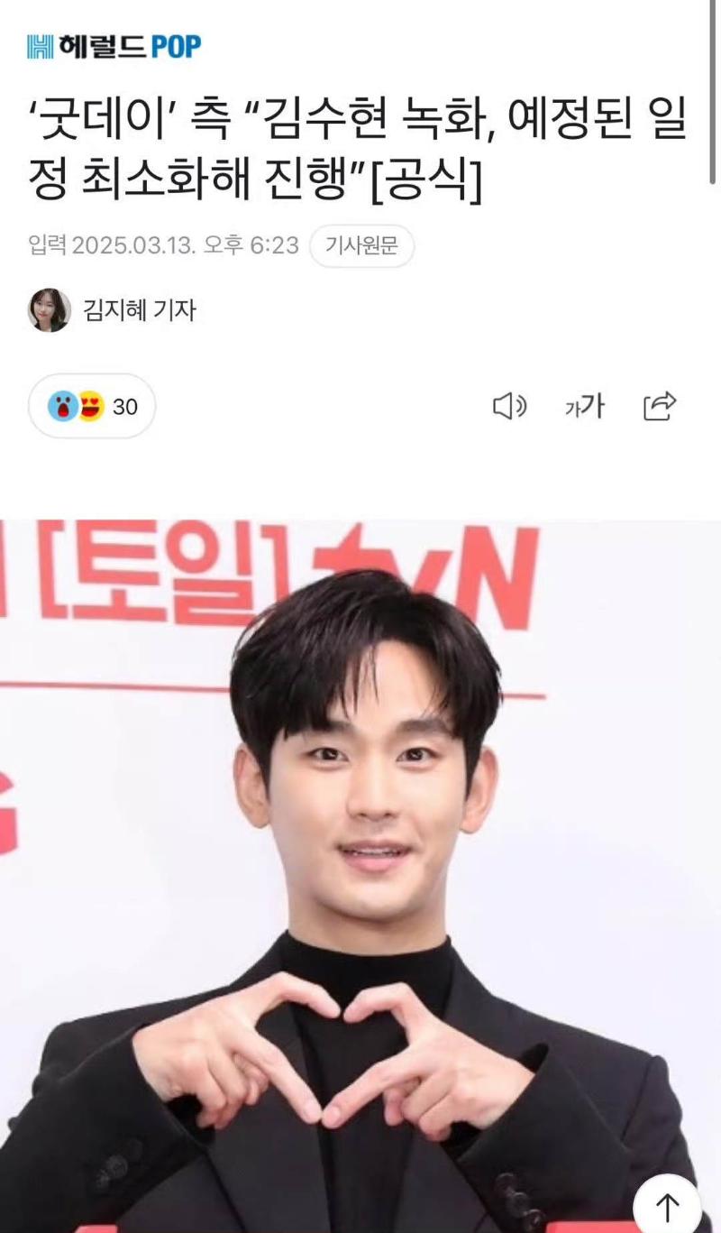 隨後《Good Day》方面表示:「經確認,金秀賢將以最小化原定日程的方式參與錄制。」據悉金秀賢是突然在現場強行參與,所以很可能後期將最小化處理。雖然但是,《Good Day》節目的評論區直接淪陷👇