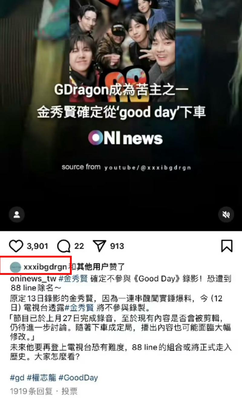 網友還發現GD居然還點讚了有關金秀賢下車Good Day的INS帖👇