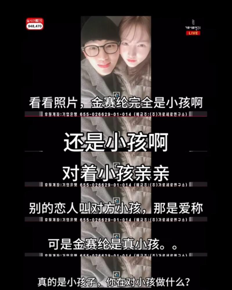 而橫豎研究所在直播中質問金秀賢,表示照片中的金賽綸很明顯就是個孩子,其他人叫戀人「孩子」是暱稱,但金賽綸真的是小孩子:「你在對小孩子做什麼!」