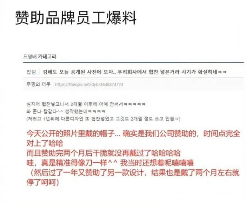 不僅如此,還有自稱是金秀賢戴著的帽子品牌員工,在韓網發帖爆料,錘了拍照日子就是在16年前後!原因是該款帽子是贊助品,是在15年12月左右提供的,而且贊助完兩個月之後,金秀賢就再也沒有戴過了。一直到17年設計了新款,再次戴著出鏡,不過也是只戴了贊助期限的兩個月。