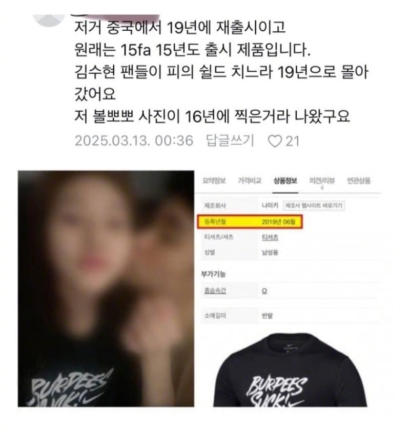 另外,網友也舉證據反駁金秀賢立場。金秀賢方說和金賽綸合照是2020年的圖,而照片中金賽綸穿的是2019年上市的衣服款式,但網友扒出合照裡的T恤,是2014年上市的款式,金賽綸本人是2016年上傳的圖片。