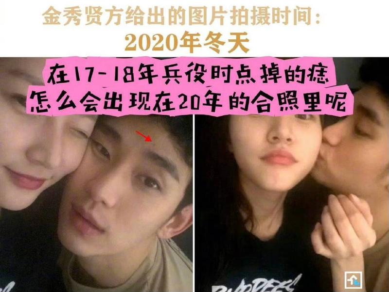 3)男方額頭上的痣,在2017年入伍的時候就已經消掉了,卻在「2019年」的照片裡「憑空」出現。金秀賢老粉也證實,退役之後,原本有的痣被點掉了,為什麼還會出現在他們聲稱是2019年的照片裡呢?