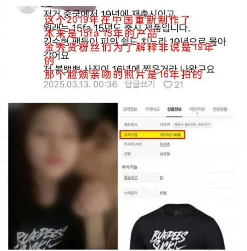 2)在「2019年」的合照,卻穿著2014年上市的衣服。金秀賢方一開始表示,合照中金賽綸穿的衣服,是2019年才上市的,但網友找到證據,這款衣服2014年就上市了,而金賽綸拍照時間是2016年。
