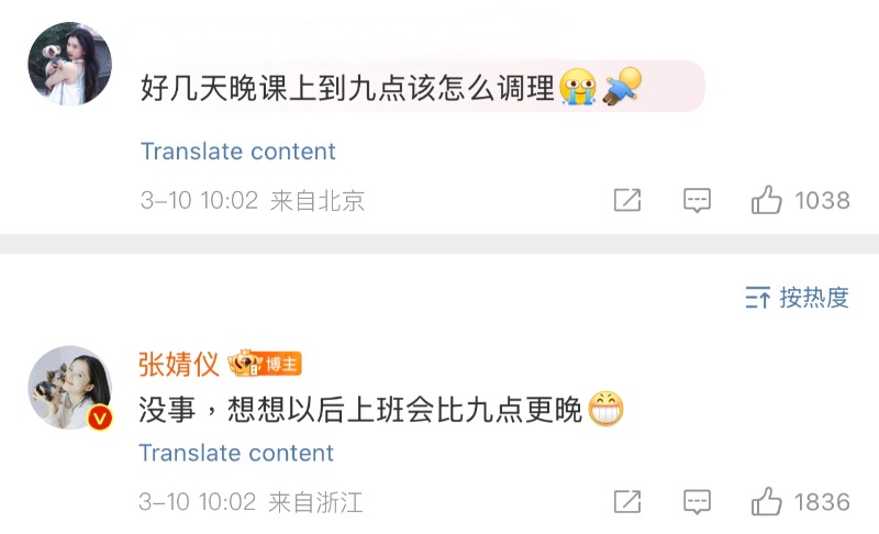 而其中一個回覆則被審判了,那就是當粉絲提到自己已經上了好幾天晚課時,張婧儀回覆:「沒事,想想以後上班會比九點晚!」
