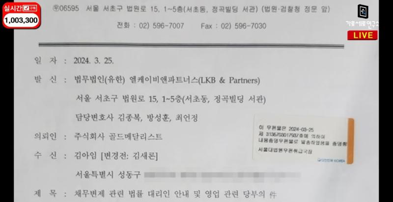 我們法律事務所作為委托人公司的法律代理人,已于 2024年3月15 日通過內容證明要求貴方清償根據金錢消費借貸合同所産生的686,409,653 韓元債務。