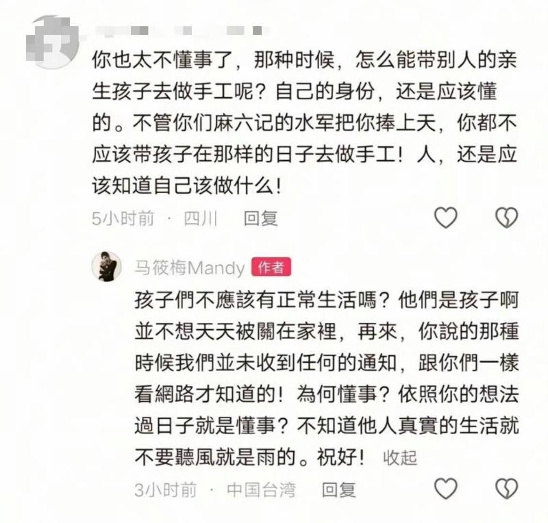 對於親生媽媽下葬,孩子們不但沒有去參加葬禮,反而還去了手工課,不少網友表示不解,就有網友到Mandy社交平台留言,指責她「太不懂事」,不應該在那樣的日子去做手工!